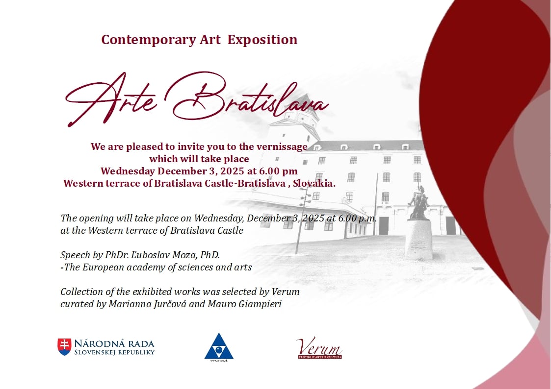 Mercoledì 3 dicembre, al Castello di Bratislava, Slovacchia, si inaugura la mostra internazionale “ARTE BRATISLAVA“, organizzata dal Centro d’Arte e Cultura VERUM e curata dalla prof.ssa Marianna Jurcova e dal curatore Mauro Giampieri.
