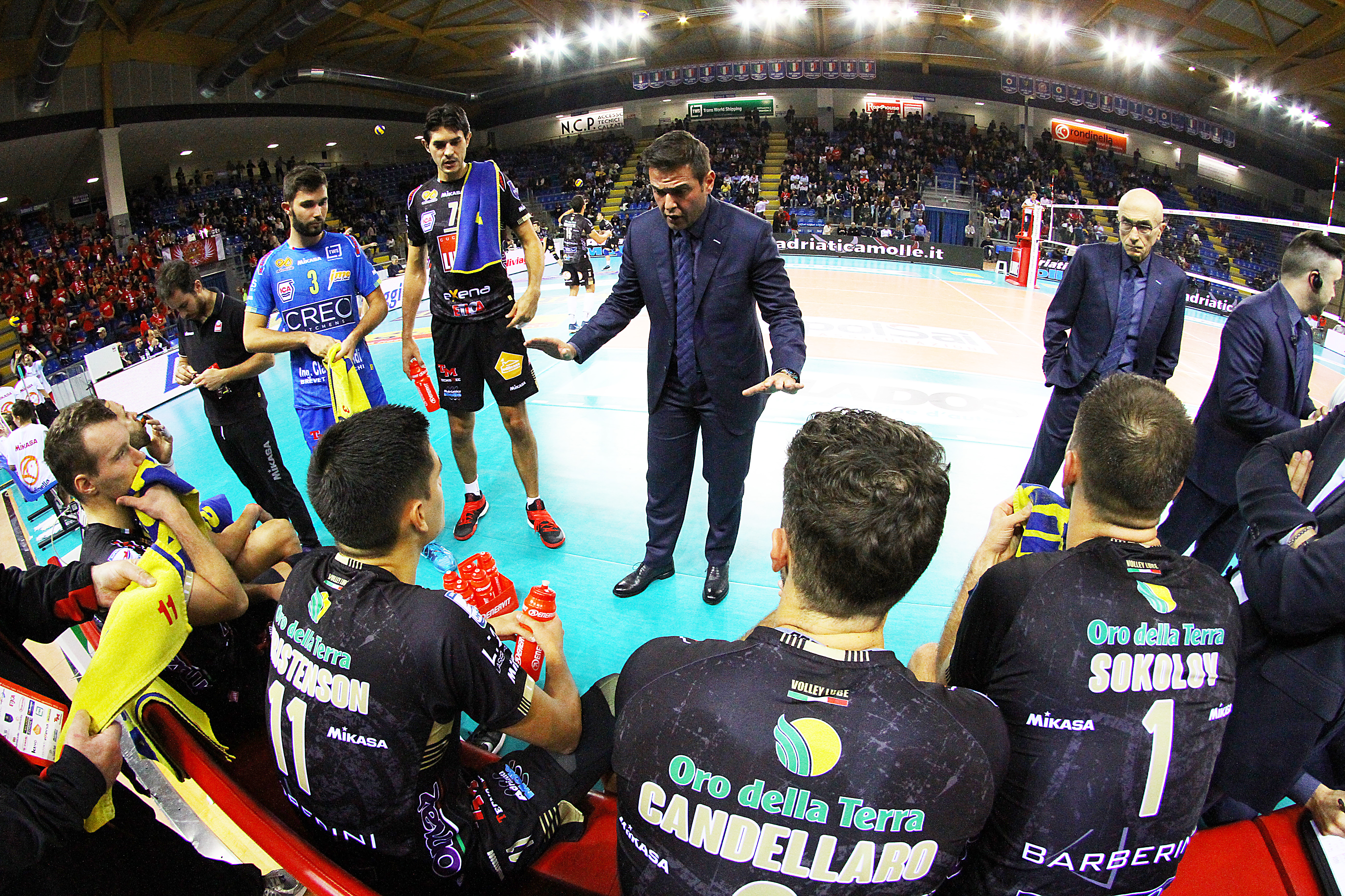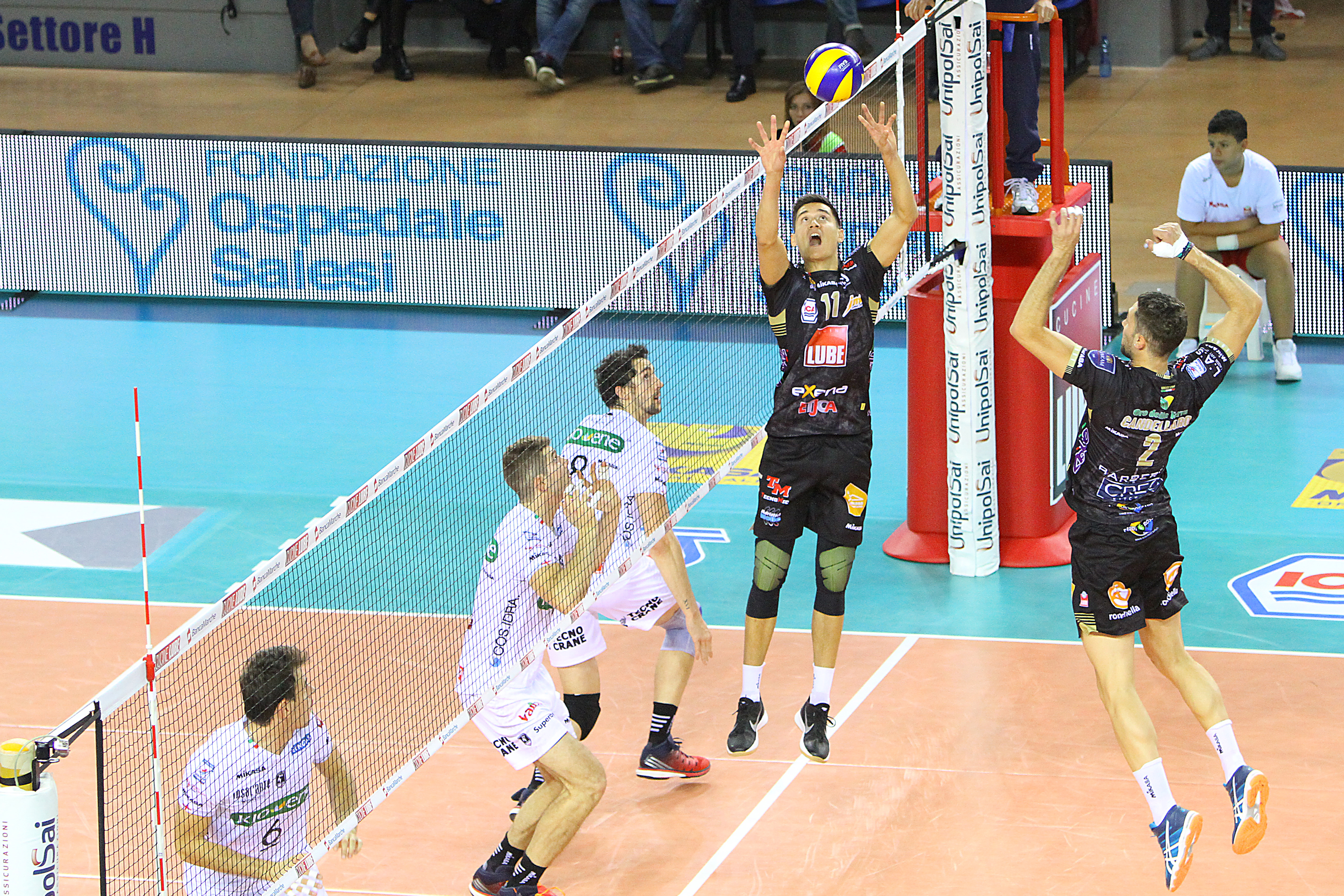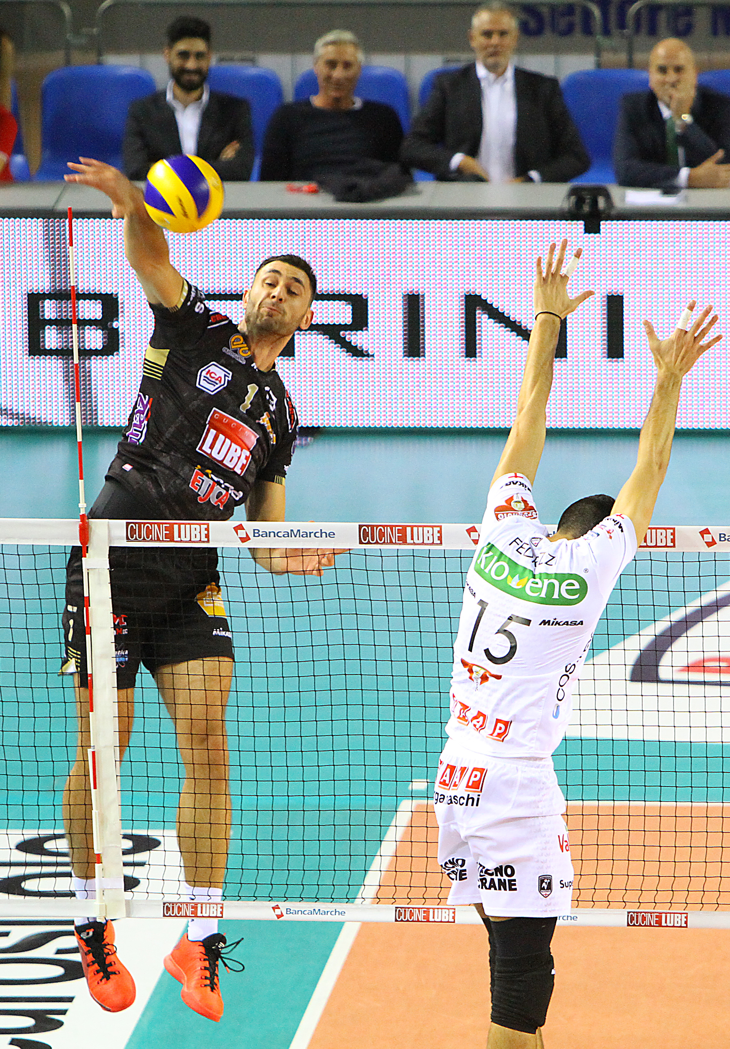 la Kioene cerca di allontanarsi dai padroni di casa con la diagonale vincente dello schiacciatore canadese Maar, ma Sokolov sfodera due parallele riportando le due squadre in parità (14-14). Sul 20-21, l’opposto bulgaro fa fallo in battuta, toccando la riga, concedendo il punto agli avversari, i quali restituiscono il punto allo stesso modo con il fallo in battuta di Koncilja (21-22). A questo punto, al posto di Kaliberda in seconda linea entra Grebennikov, che permette alla Lube di segnare il suo ultimo punto del set con l’alzata in bagher per Juantorena che attacca la diagonale vincente del 22-24. Al servizio Stankovic batte out, permettendo alla Kioene di portarsi a casa il primo set (22-25).