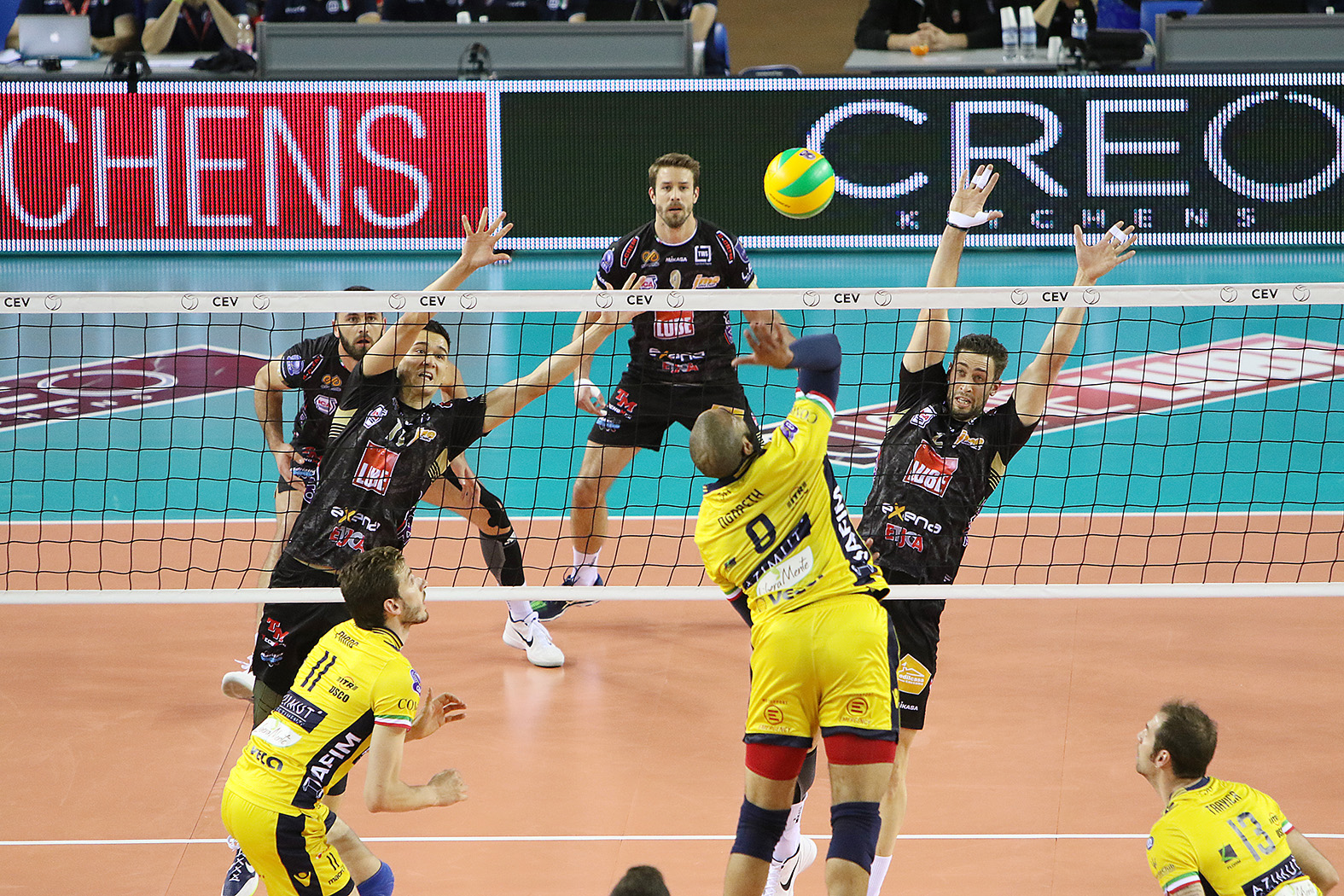 Civitanova scende in campo con la diagonale Christenson-Sokolov, le bande Kovar-Juantorena, i centrali Stankovic-Candellaro e Grebennikov come libero. Nel sestetto gialloblu compaiono la diagonale Travica-Vettori, i martelli Petric-Ngapeth, al centro Piano-Holt e il libero Rossini.