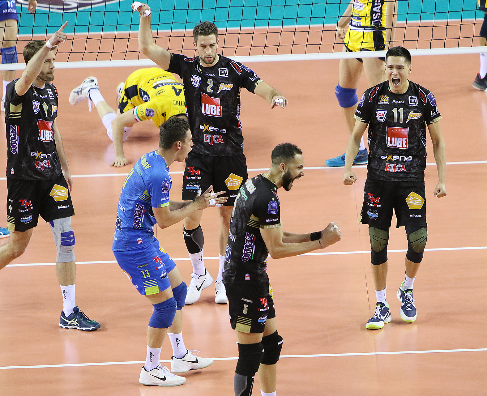 Fin dal primo set i padroni di casa riescono a tenere testa agli avversari, portandosi subito in vantaggio di due punti (7-5) grazie a due diagonali vincenti di Juantorena. Agli attacchi dell’italo-cubano seguono le bordate di Sokolov e di Kovar e i primi tempi vincenti di Stankovic e Candellaro. L’Azimut non si arrende facilmente e sfodera la carta Ngapeth, quasi sempre vincente sia dalla prima che dalla seconda linea, riuscendo a ritrovare il pareggio con l’attacco di Vettori su mani out (16-16). Interviene allora il capitano biancorosso con un primo tempo e subito dopo con un muro vincente su Holt (18-16). Intanto Travica esce e subentra Orduna, ma ormai la Lube è in netto vantaggio e chiude il primo parziale 25-21.