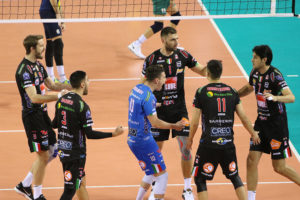 Il quarto parziale è completamente di marchio biancorosso: 5 ace (uno di Christenson sul 7-4, tre di Sander sul 10-5, 13-5 e 14-5, e uno di Cester 21-9); anche in attacco i civitanovesi se la sono cavata abbastanza bene sia dal centro grazie a uno Stankovic determinato, anche a muro, sia da posto sei con le pipe di Sander, e sia da posto due con le cannonate dell’opposto bulgaro, che firma il punto decisivo per chiudere il match (25-12).