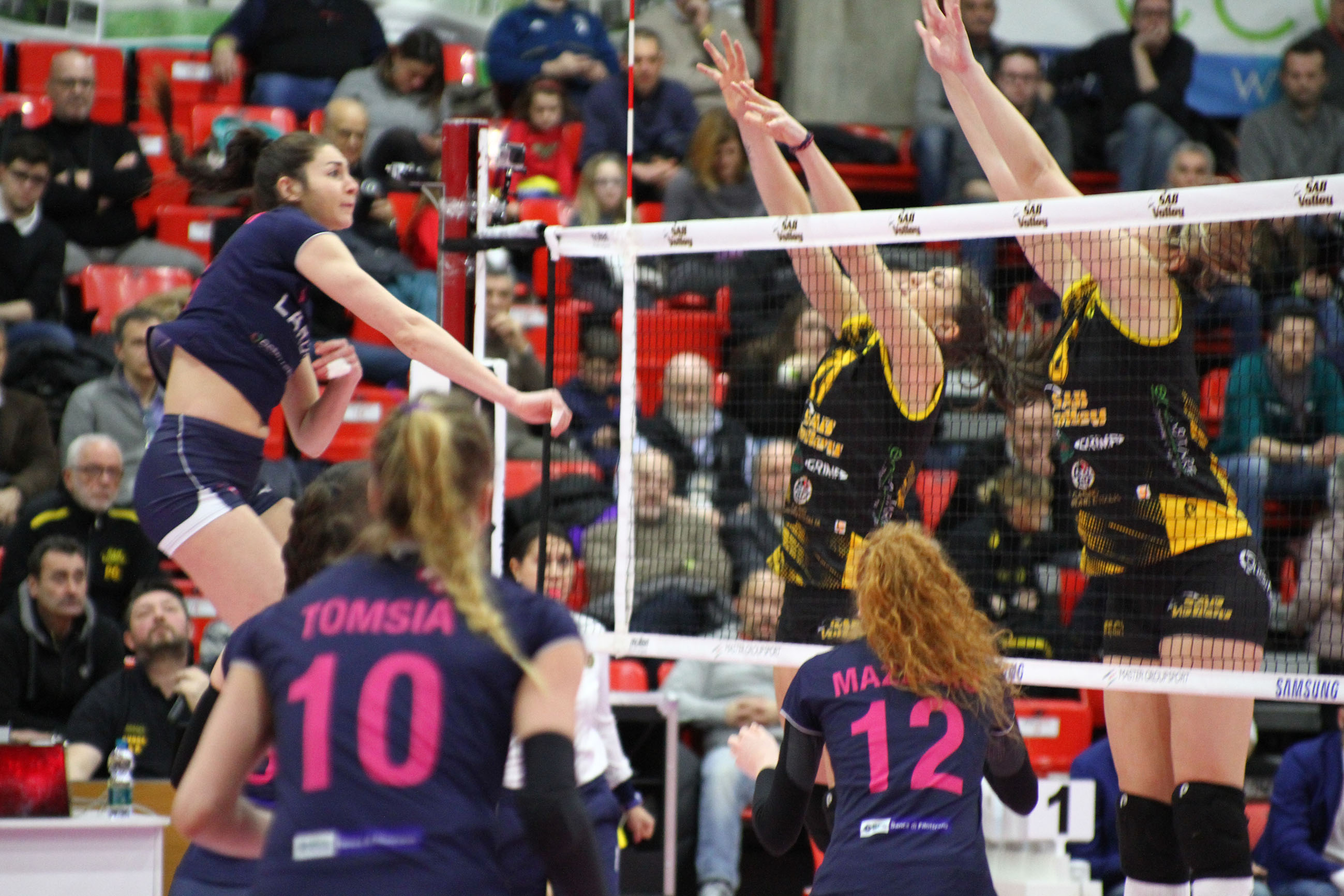 Barcellini si fa carico di riprendere Filottrano e riportare avanti la Sab (14-13), la Lardini torna a mettere le ali (18-21) con Mitchem e Scuka, che producono punti pesanti, specie nel momento in cui Legnano torna sotto con il muro di Coneo (20-21): prima Scuka e poi Mitchem (8 punti nel set) garantiscono l’1-1 alla Lardini. La Sab riparte dal servizio di Ogoms (2-1), la Lardini dal muro di Mazzaro (3-4). Filottrano trova beneficio con la battuta di Mitchem (5-6) e con l’attacco della scatenata americana (8-10), ma deve fare i conti con Degradi e il muro di Pencova (11-10). Feliziani spolvera la metà campo Lardini, Mitchem colpisce e rimette a guidare (12-13) una Lardini che capitalizza l’ottimo servizio di Bosio e gli attacchi di Scuka (15-17). E’ soprattutto il turno al servizio di Tomsia a lanciare Filottrano, coach Buonavita si affida a Cumino e Bartesaghi, ma è ancora la battuta di Tomsia a far male (15-21). La Sab però proprio non molla, Degradi e il muro di Pencova (3 nel set) la riportano sotto (21-22).