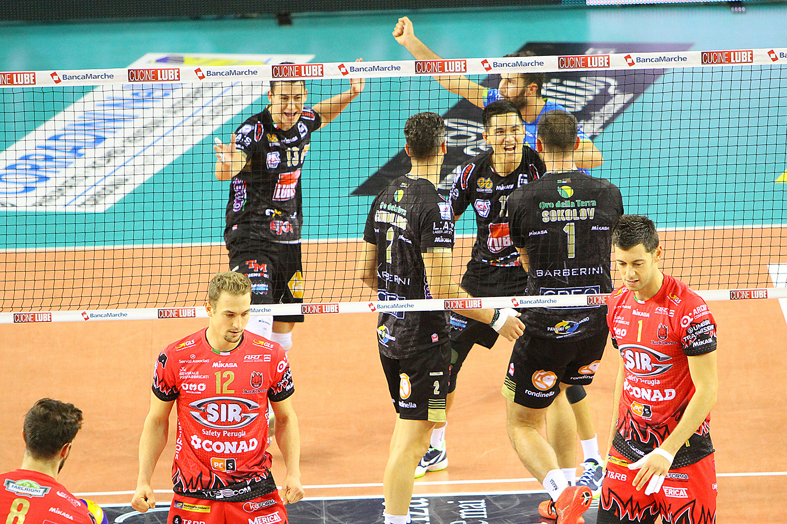 Ma è nel terzo set che la Lube sorprenderà tutti. Cester entra su Candellaro e Cebulj resta in campo al posto di Kaliberda. Dopo un altro inizio drammatico (2-5 per la Sir), Blengini chiama il time out. La squadra si riattiva con un Cebulj che firma l’ace del pareggio (9-9). Anche Sokolov guadagna una serie di punti in attacco che permettono alla padrona di casa di passare in vantaggio e di vincere il set con un Juantorena incontenibile (due ace consecutivi). Dopo la battuta out di Russell, la Lube si aggiudica il terzo parziale (25-23).