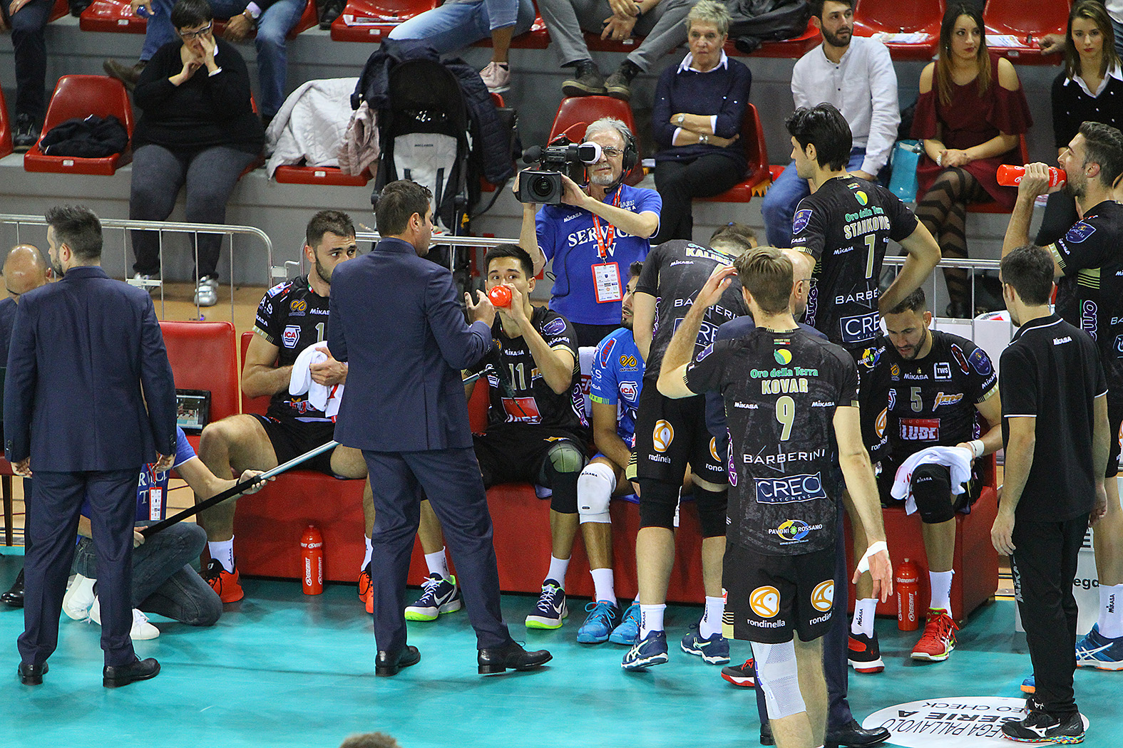 Nel primo parziale il Perugia parte subito in vantaggio con l’errore in battuta di Juantorena. Gli umbri si fanno strada con le diagonali vincenti dello statunitense Russell e di Zaytsev, portandosi sul 2-6. Sul 4-8, Juantorena cerca di riequilibrare il punteggio con tre attacchi vincenti (7-8), ma il muro avversario ferma i cucinieri più volte riportandosi in netto vantaggio. Sokolov tenta il riavvicinamento con due attacchi di prima intenzione (20-21), ma anche questa volta gli ospiti salveranno la situazione dapprima con l’attacco vincente di Berger, poi con il primo tempo di Buti ed infine con il muro di Russell sull’attacco di Sokolov. Il set termina 22-25.